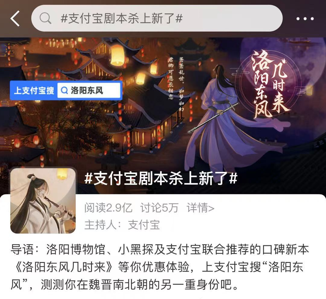 一本几万字的剧本杀就能赚几万甚至几十万,听起来似乎很不可思议,但这在业内是正常现象。 我们现在在很多的大众app上面都能看到剧本杀的身影,比如洛阳博物馆×支付宝×小黑探剧宝×《洛阳东风几时来》联合发起的#支付宝剧本杀上新了的话题,热度就直接突破2.9亿。
